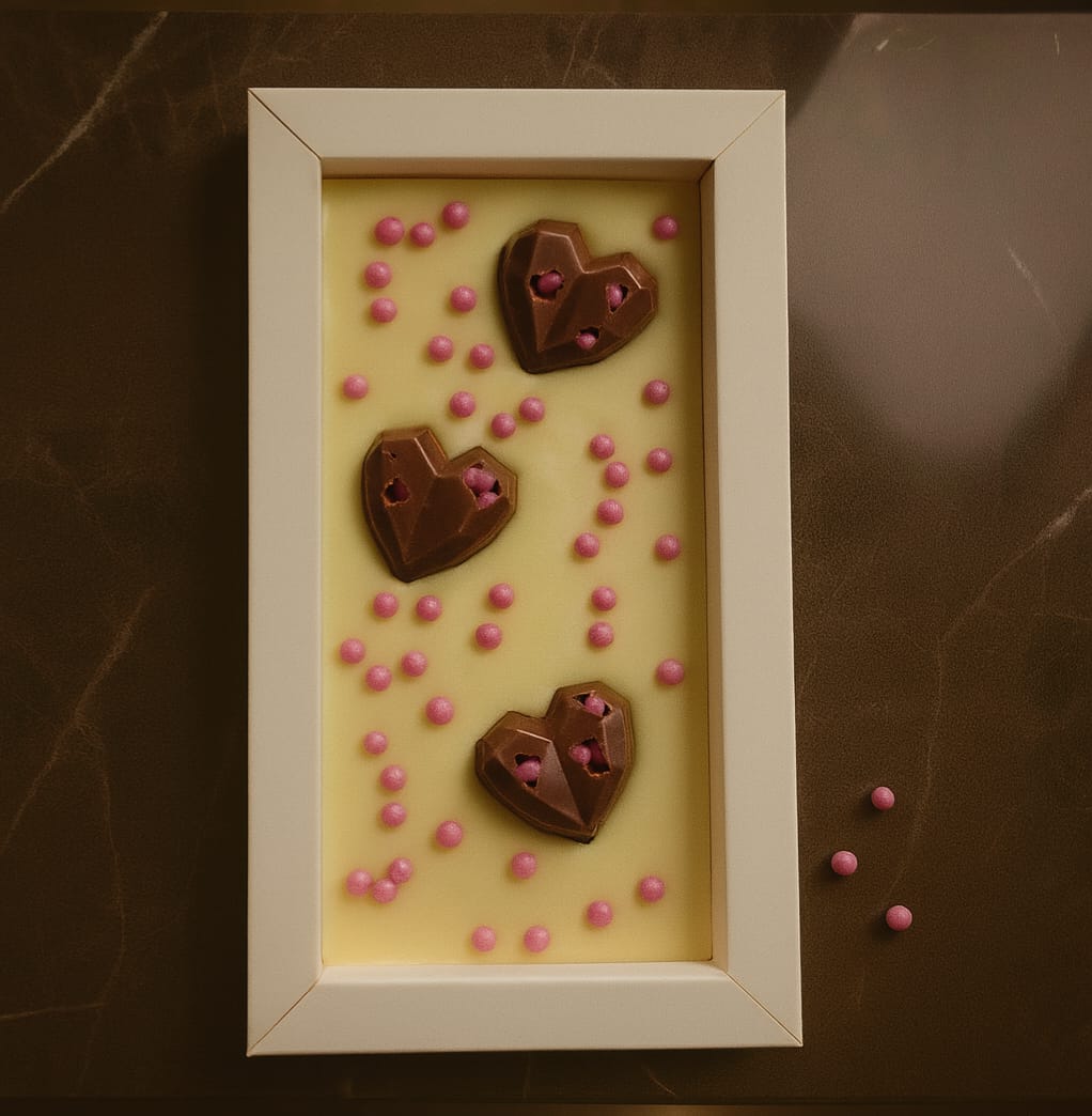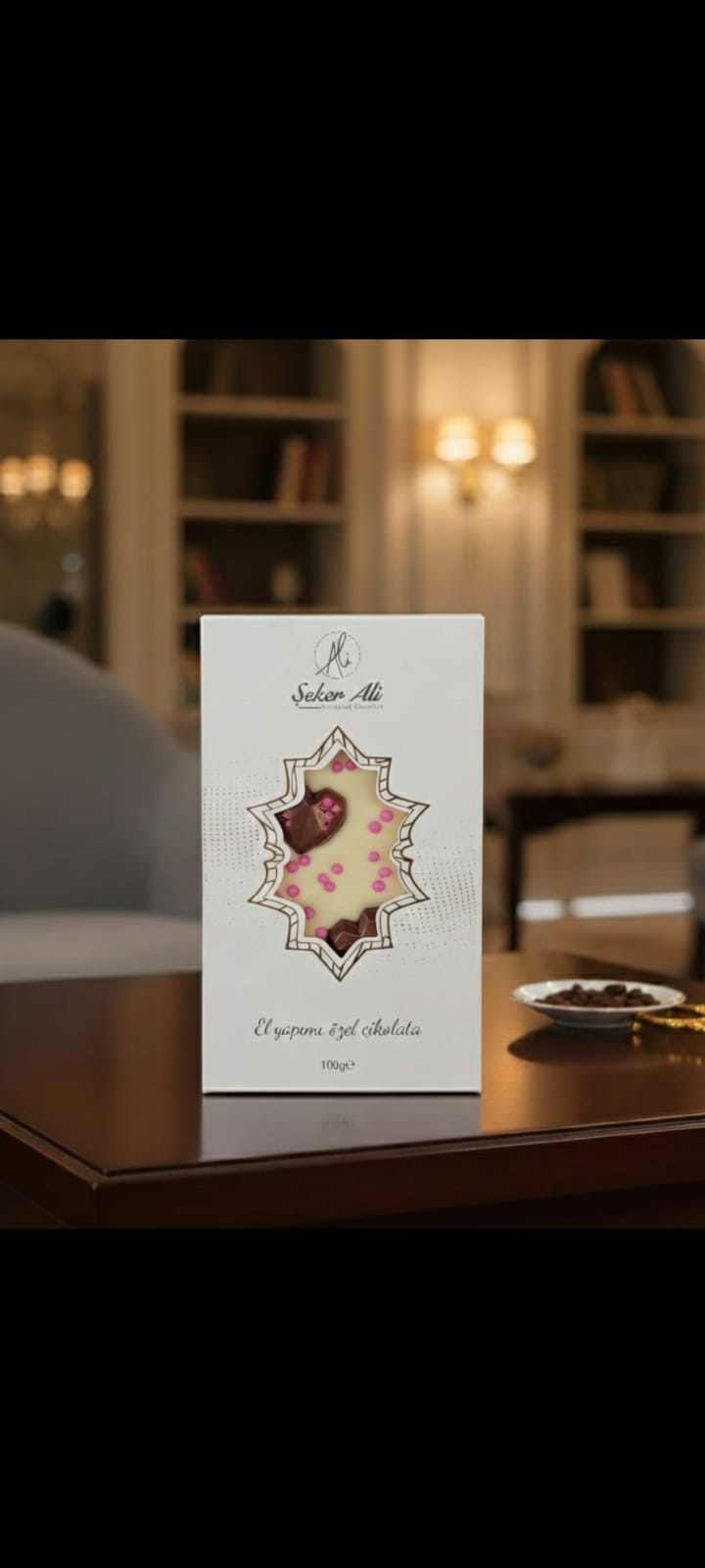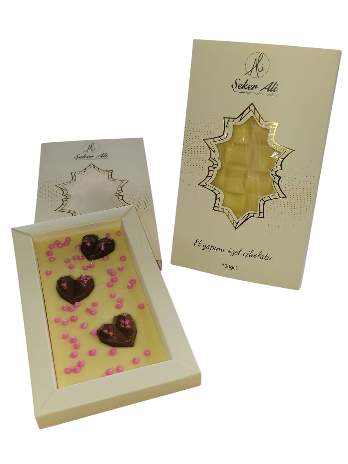 Belçika çikolatasından üretilen el yapımı beyaz çikolatalı süslü tablet çikolata net 100 gram