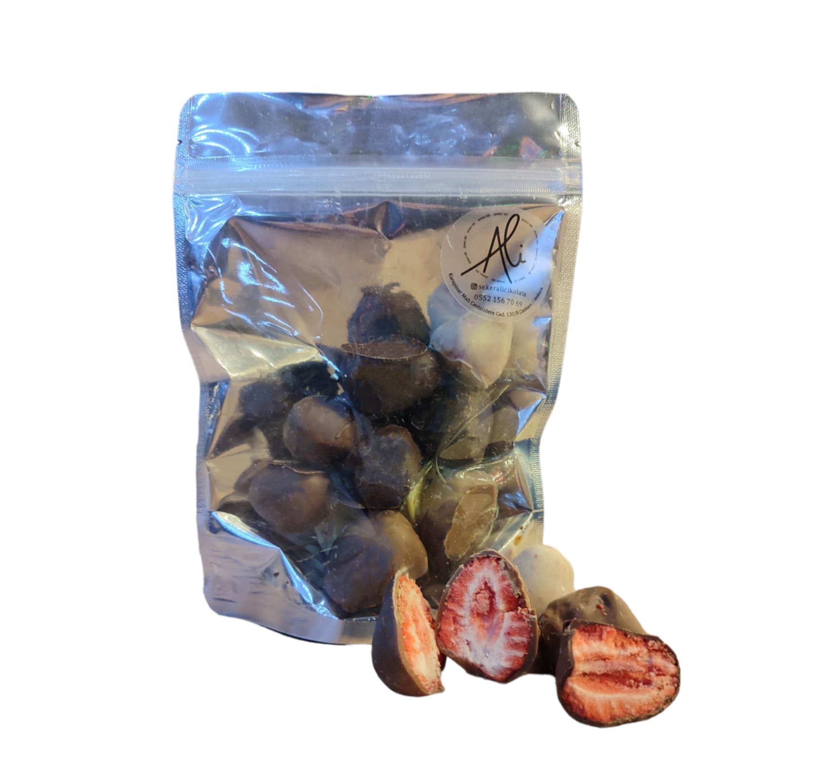 Gerçek belçika çikolatası ve enfes çilek kurularından hazırlanan atıştırmalık