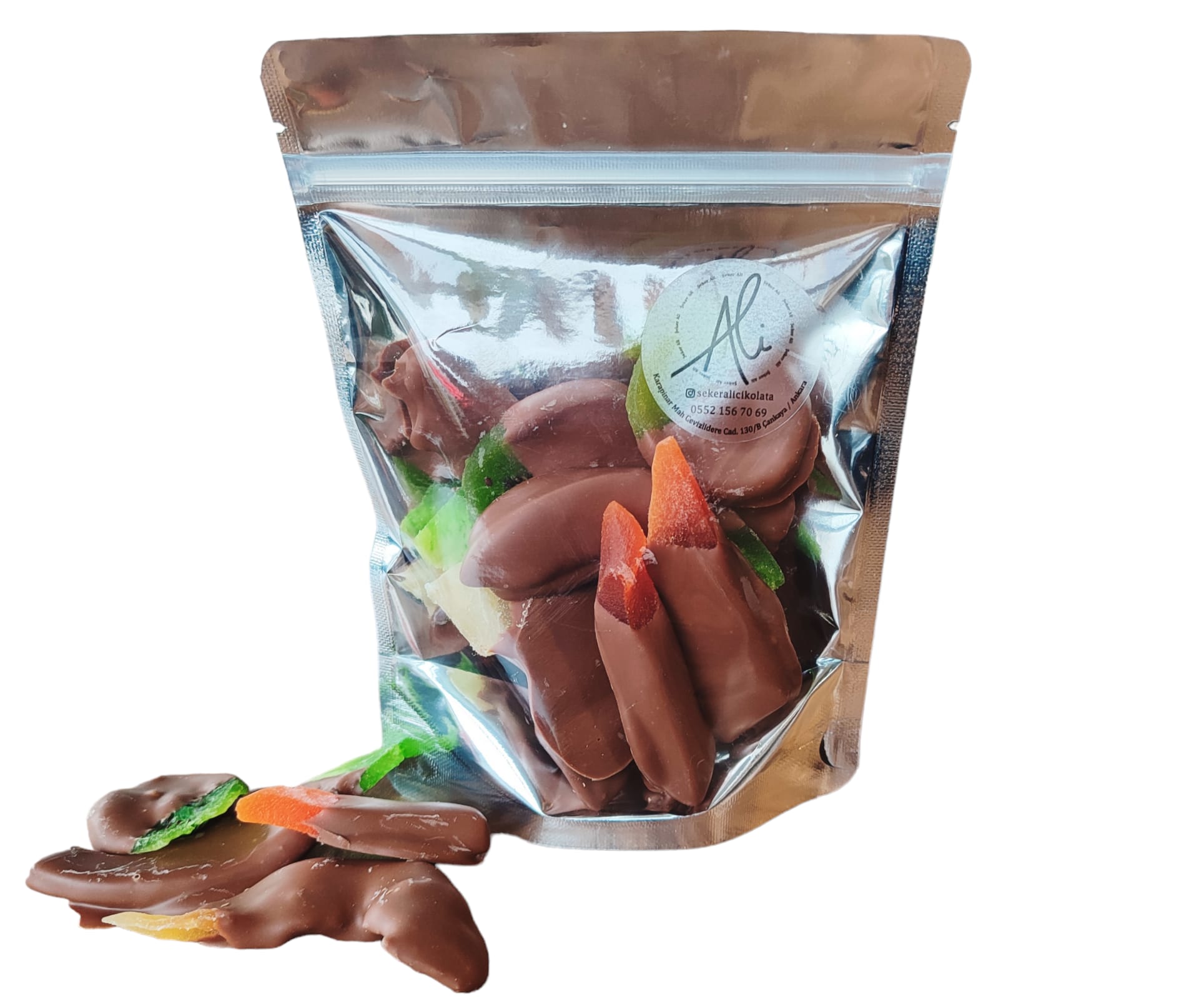 Gerçek belçika çikolatası ve enfes tropikal meyve kurularından hazırlanan atıştırmalık çikolata kaplı meyveler
