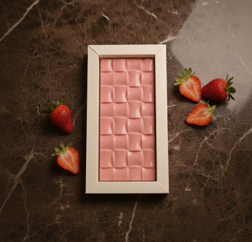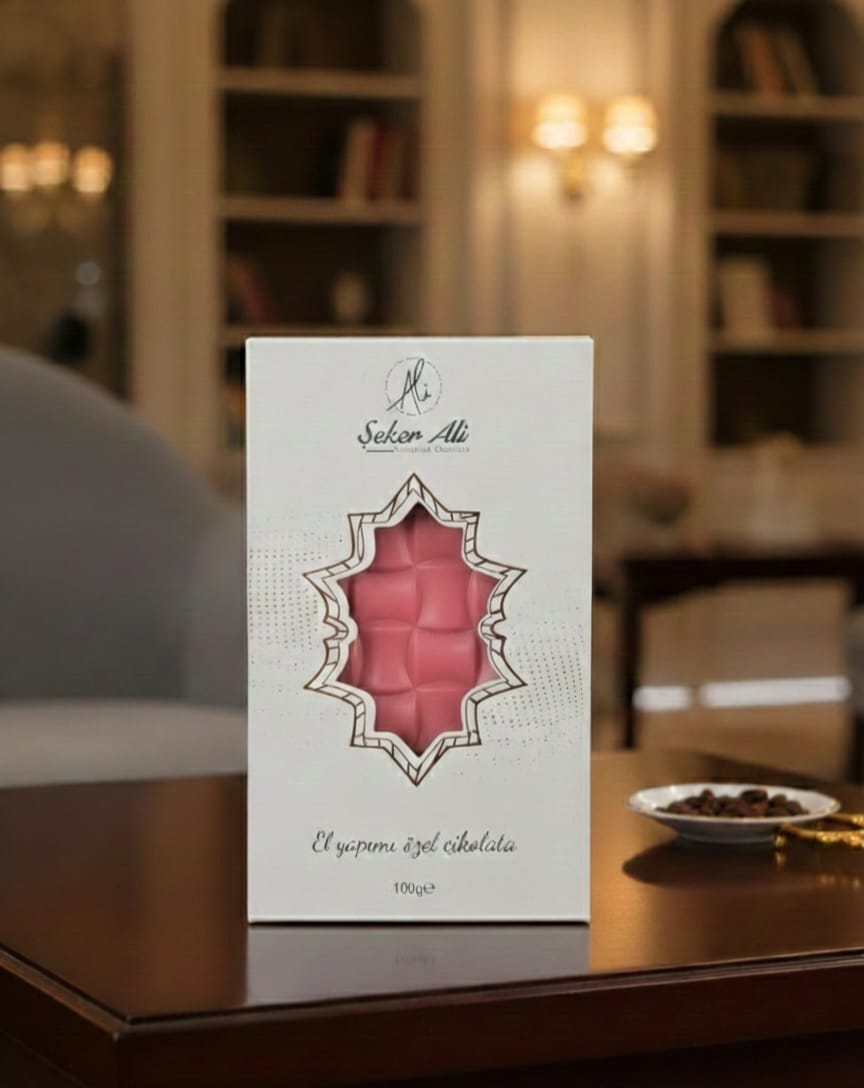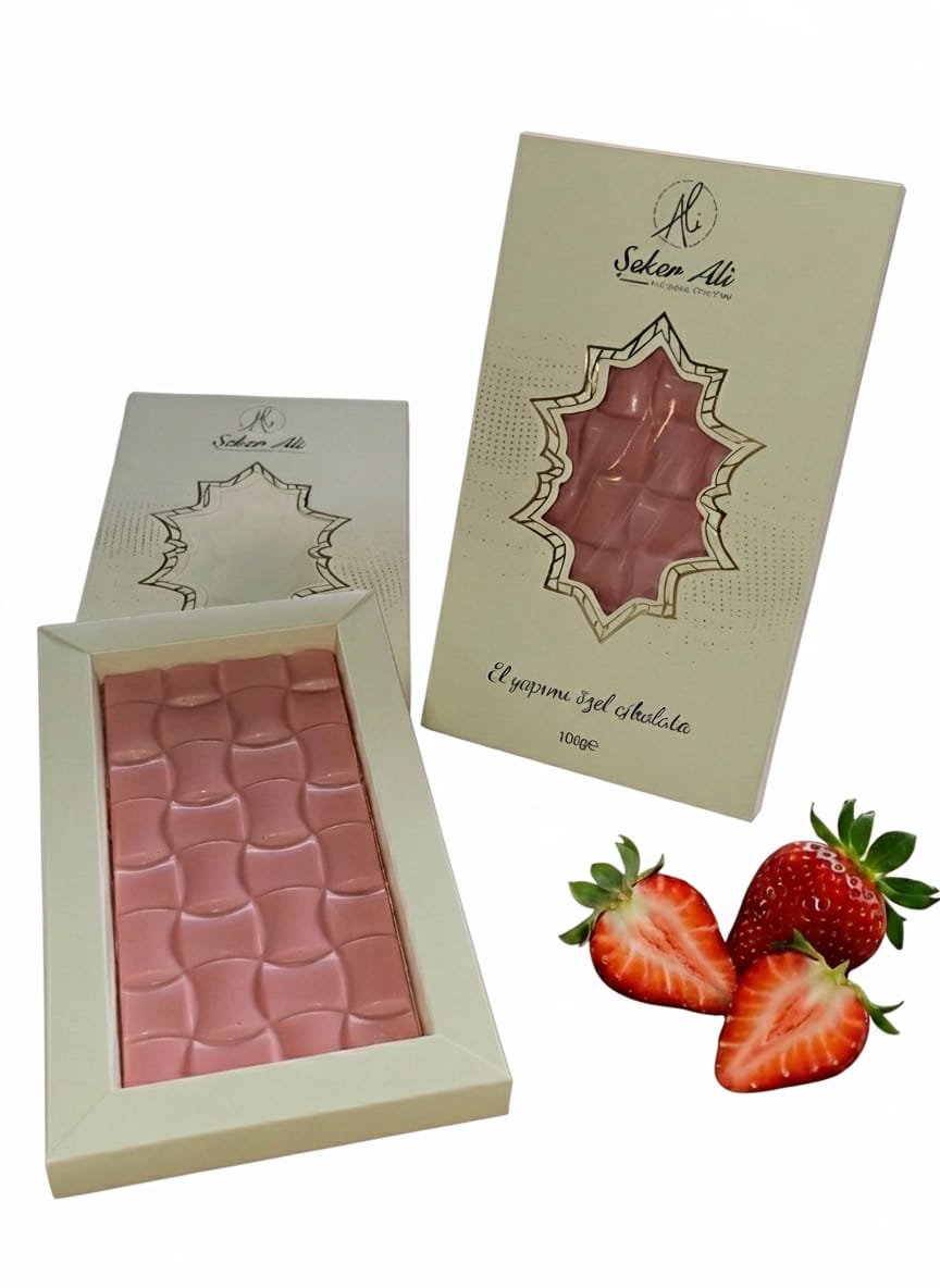 Belçika çikolatasından üretilen el yapımı çilekli tablet çikolata 100g e