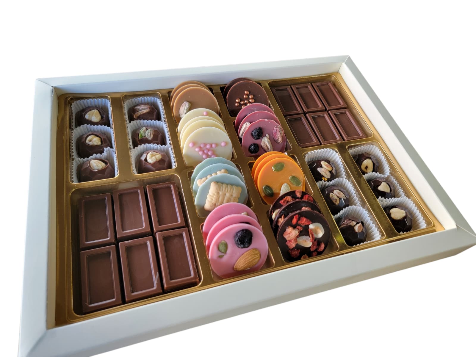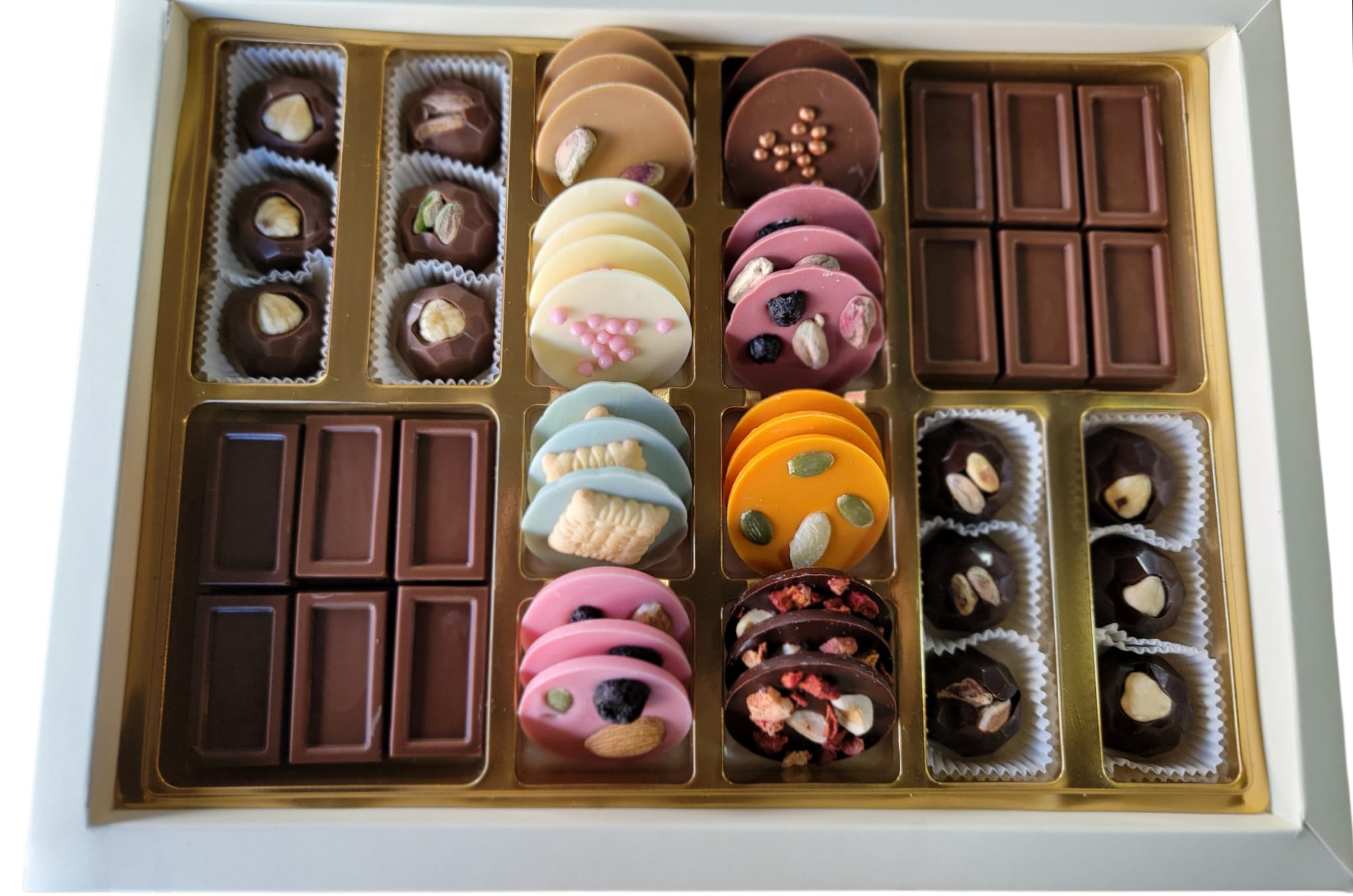 içerisinde sütlü, bitter, beyaz, portakal, ruby, çilek ve misket limonlu çikolatadan hazırlanan kuruyemişle süslenen el yapımı belçika çikolatası