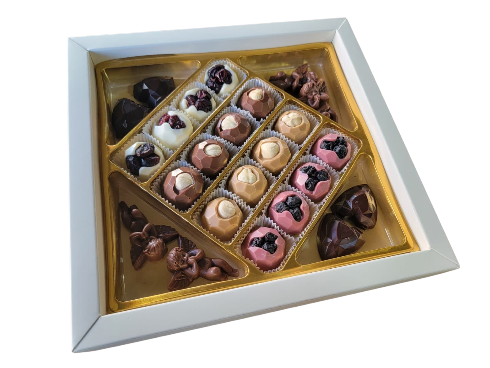 Her biri özenle temperlenerek hazırlanan bu kutuda şık desenli melek ve kalp figürleri öne çıkıyor