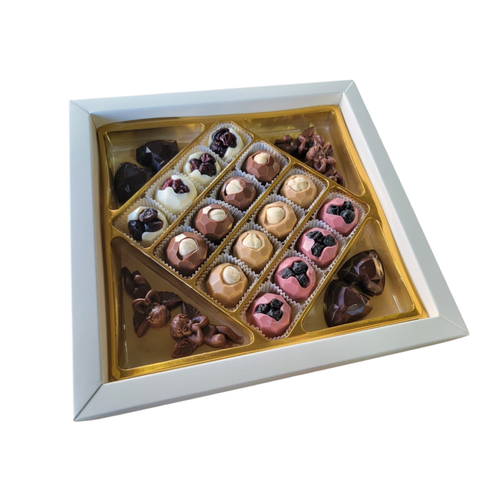 içerisinde sütlü, bitter, beyaz, karamel ve çilekli çikolatadan hazırlanan kuruyemişle süslenen el yapımı belçika çikolatası