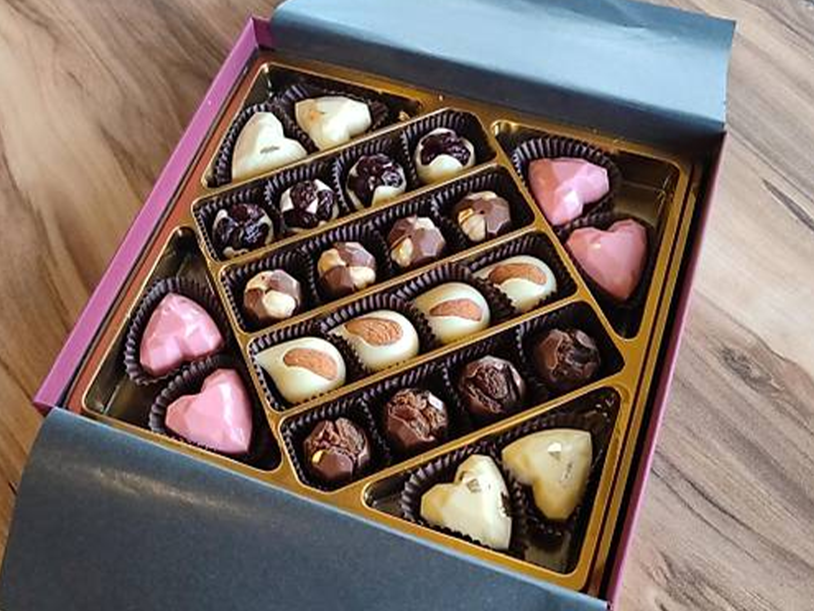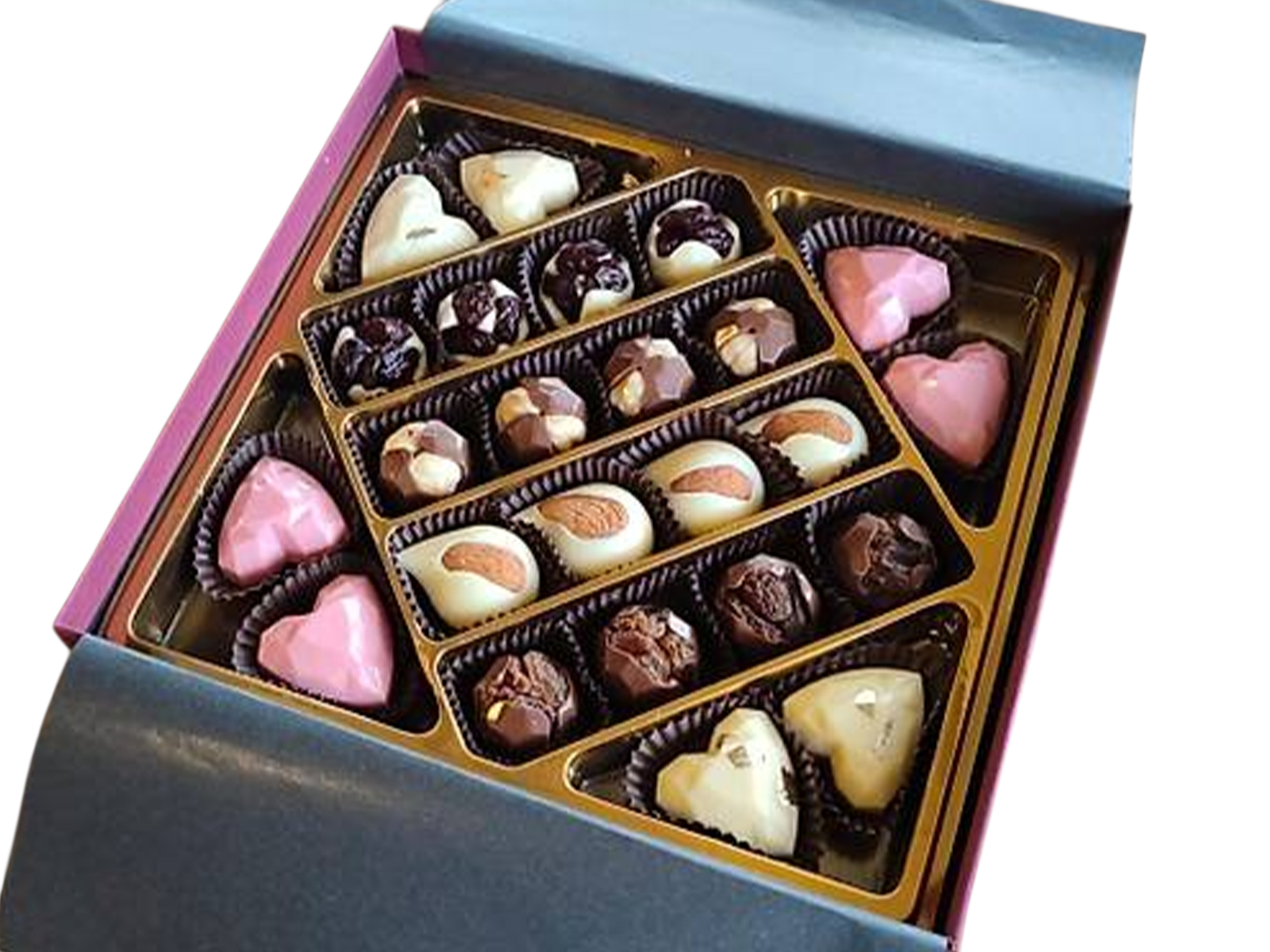 Gerçek belçika çikolatasından el yapımı olarak çilekli, sütlü, bitter ve beyaz çikolata ile hazırlanan çeşitli kuruyemişlerle süslenmiş, spesiyal çikolata kutusu 240e g