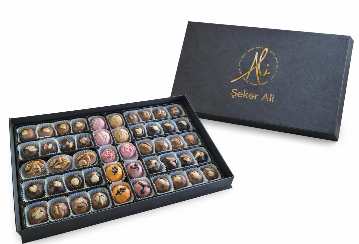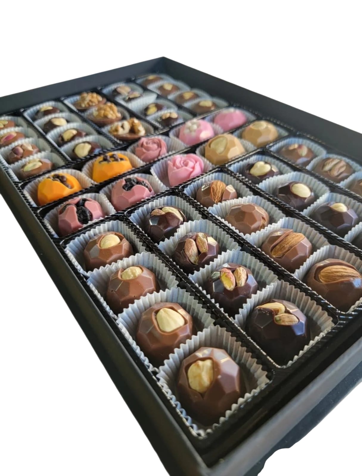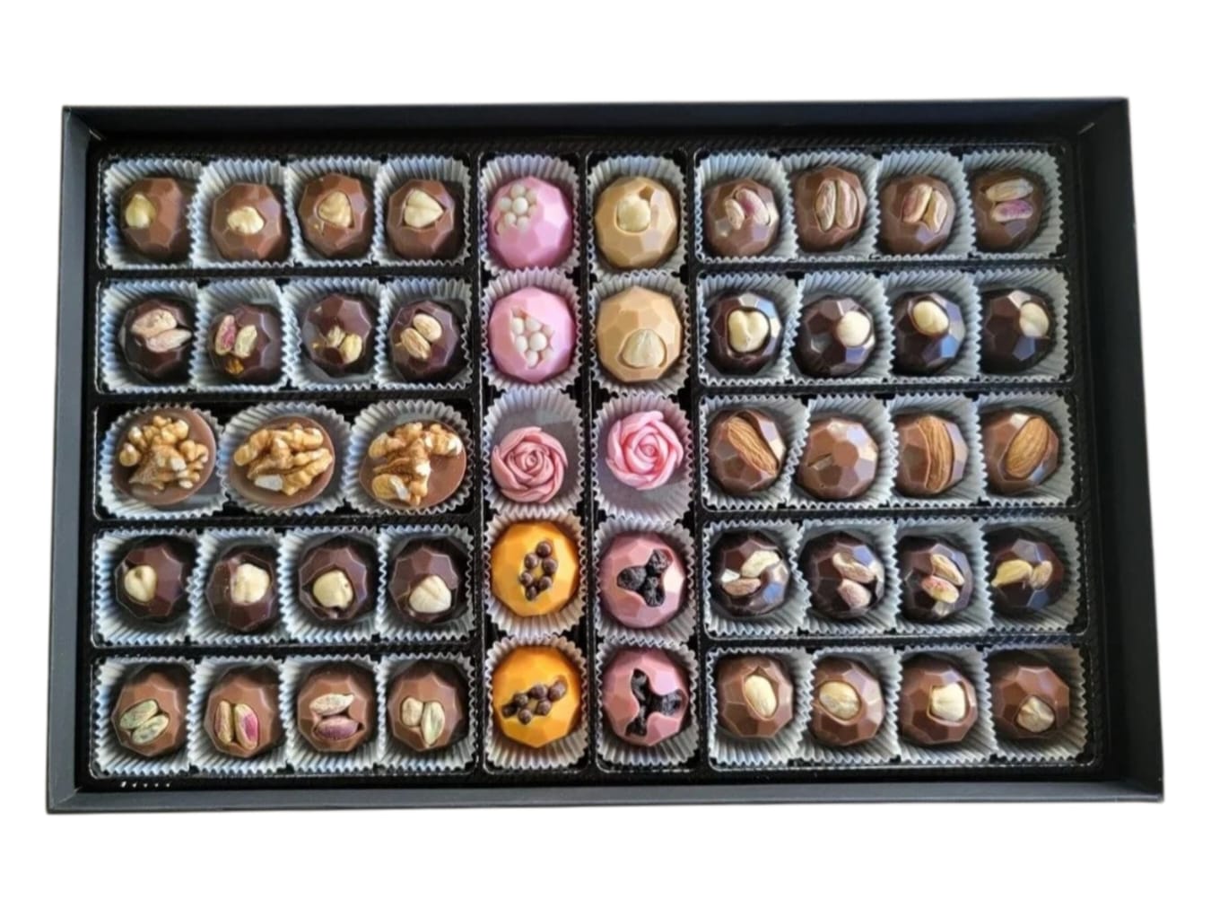 içerisinde sütlü, bitter, portakal, ruby, çilek ve karamelli çikolatadan hazırlanan, kuruyemişle süslenen el yapımı belçika çikolatası