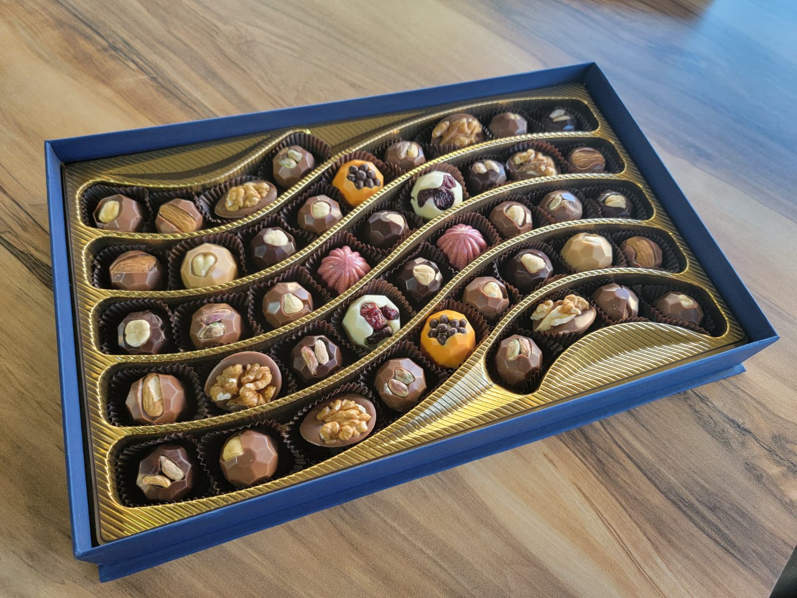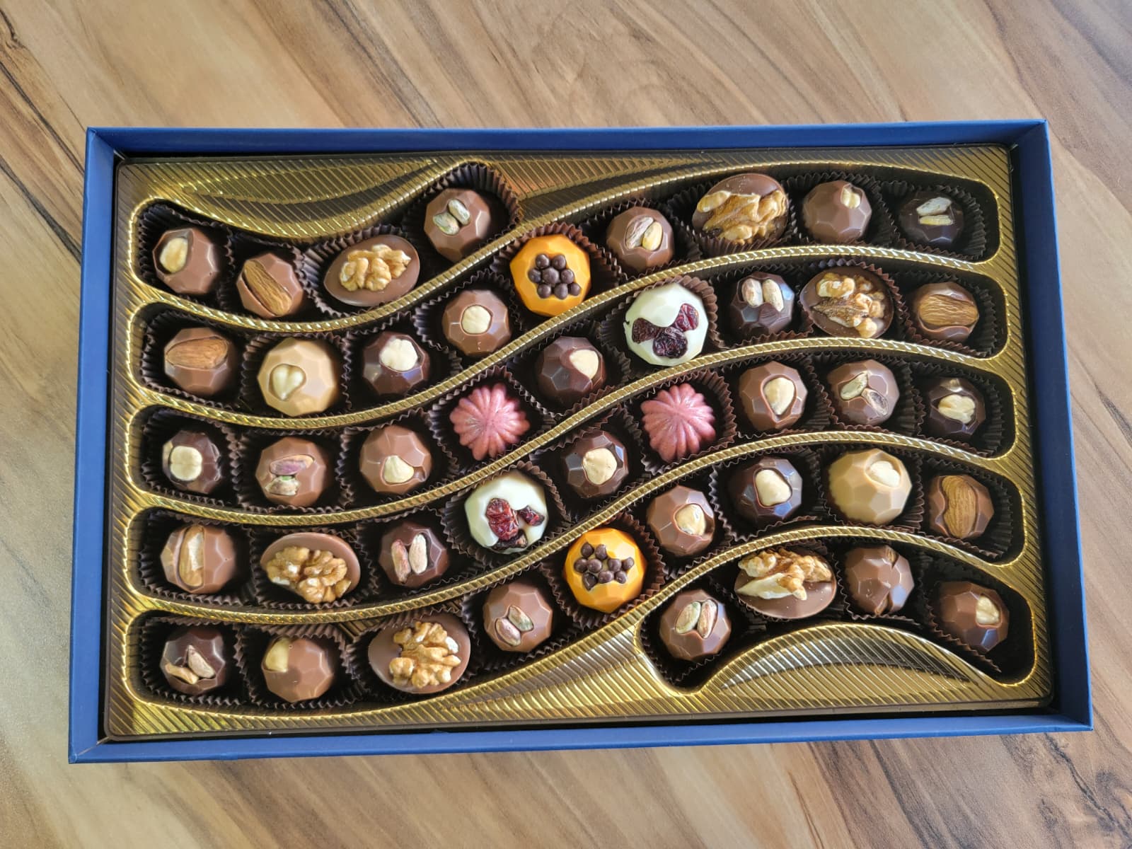 içerisinde sütlü, bitter, beyaz, portakal, çilek ve karamelli çikolatadan hazırlanan, kuruyemişle süslenen el yapımı belçika çikolatası