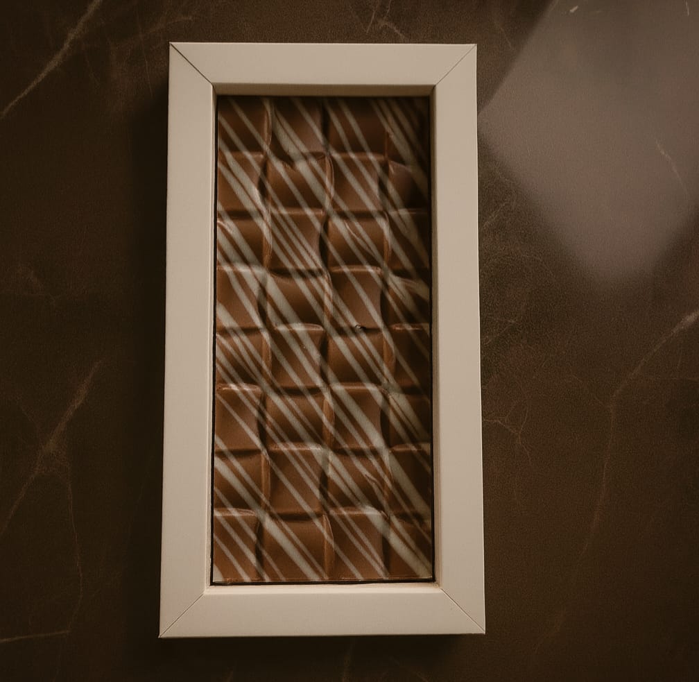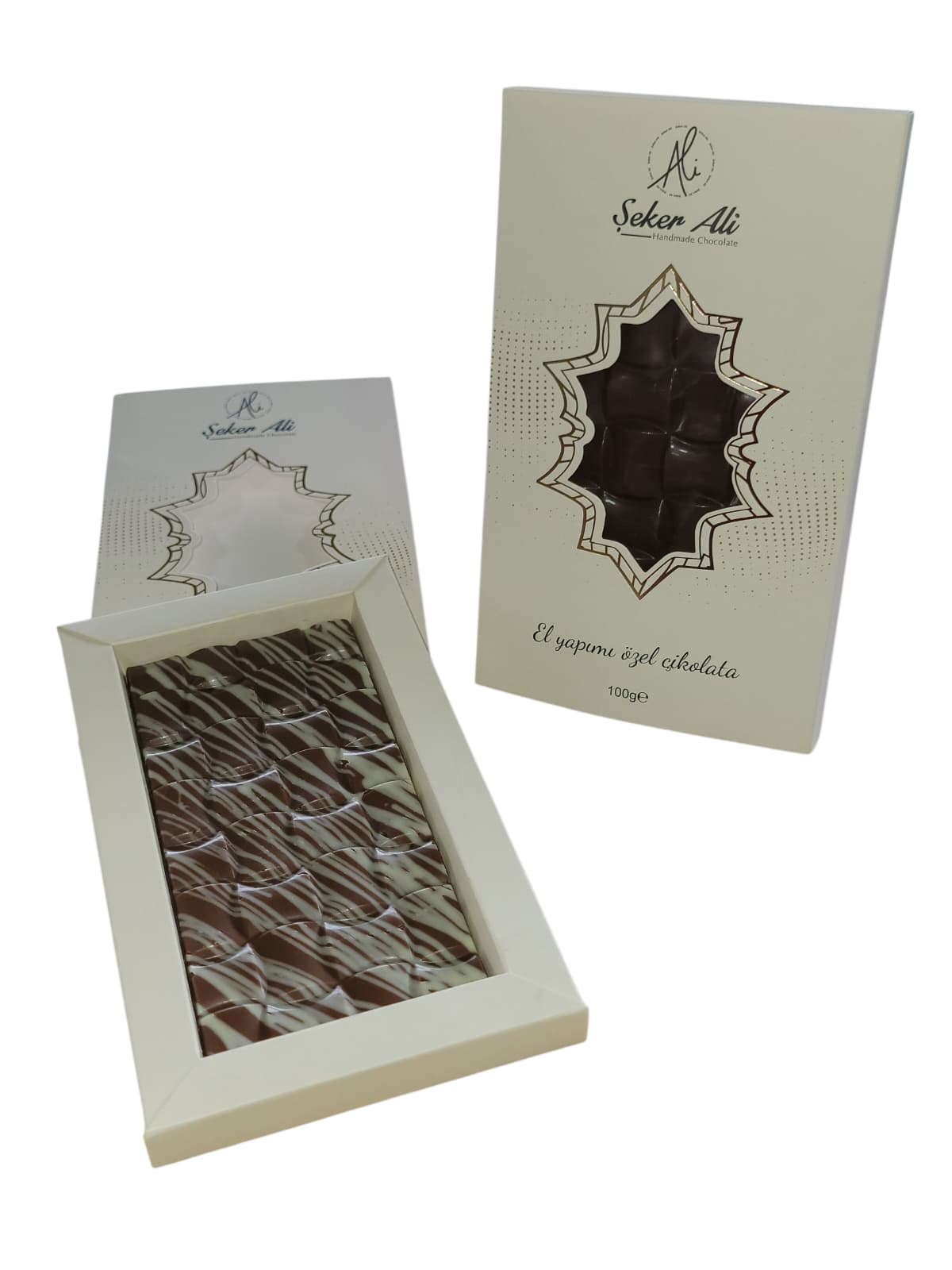 Belçika çikolatasından üretilen el yapımı sütlü beyaz çizgili tablet çikolata net 100 gram