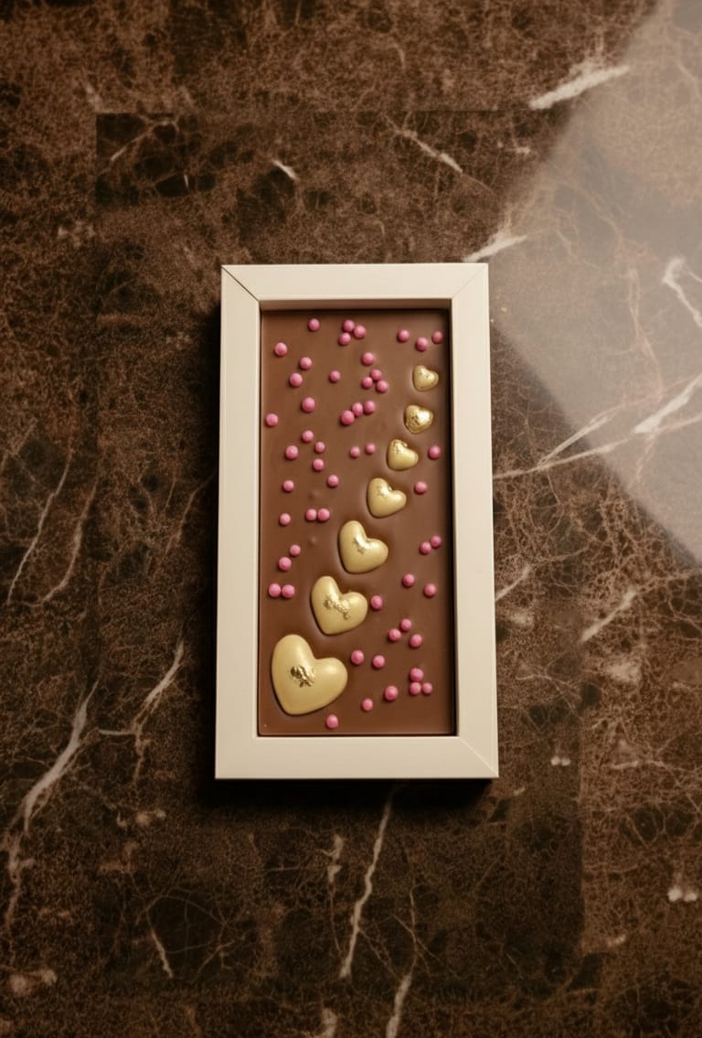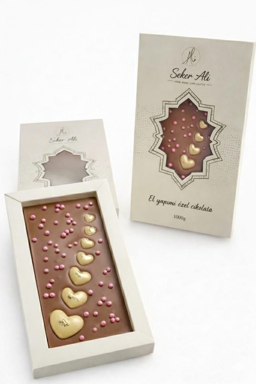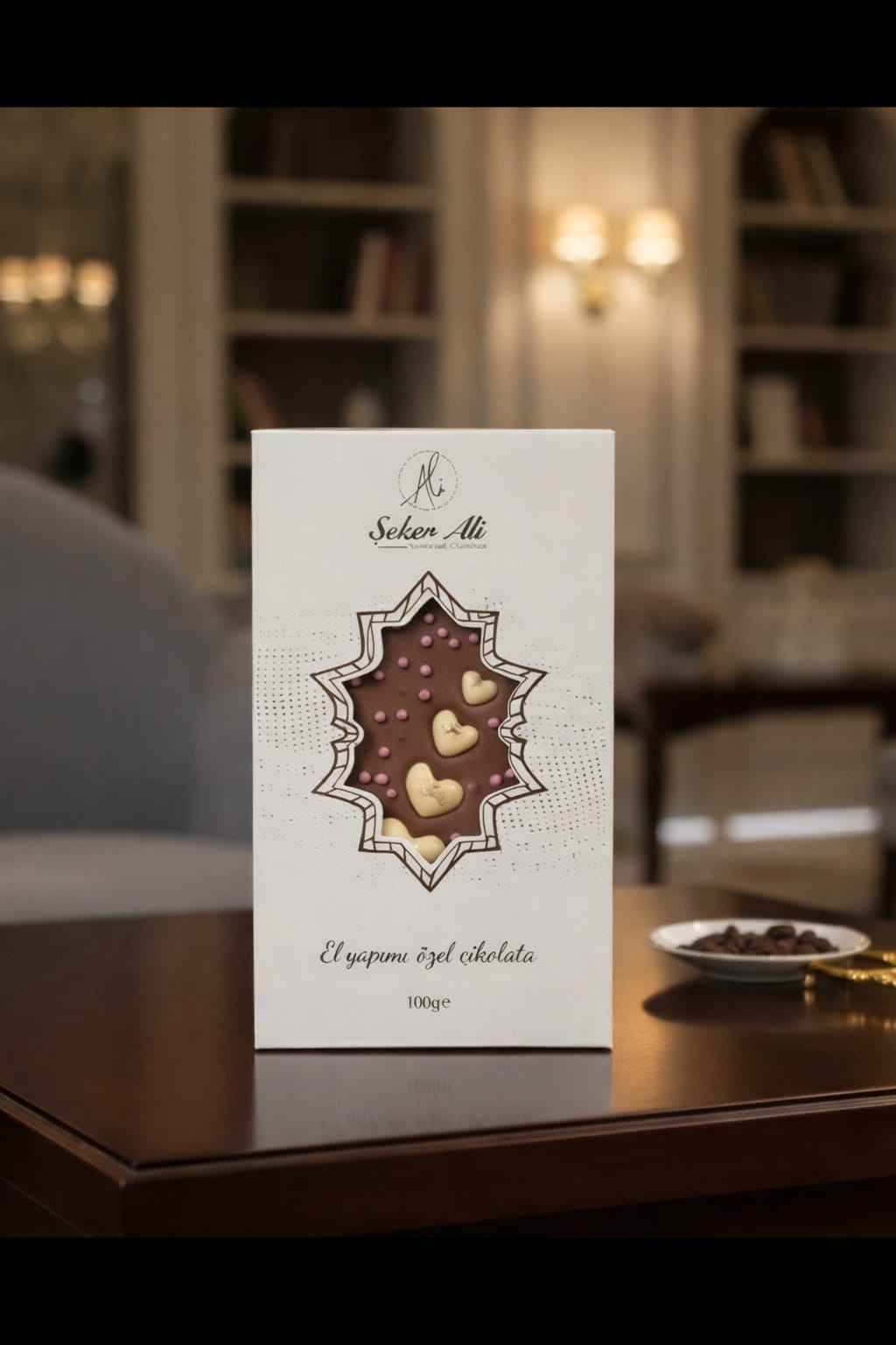 Belçika çikolatasından üretilen el yapımı sütlü süslü tablet çikolata net 100 gram
