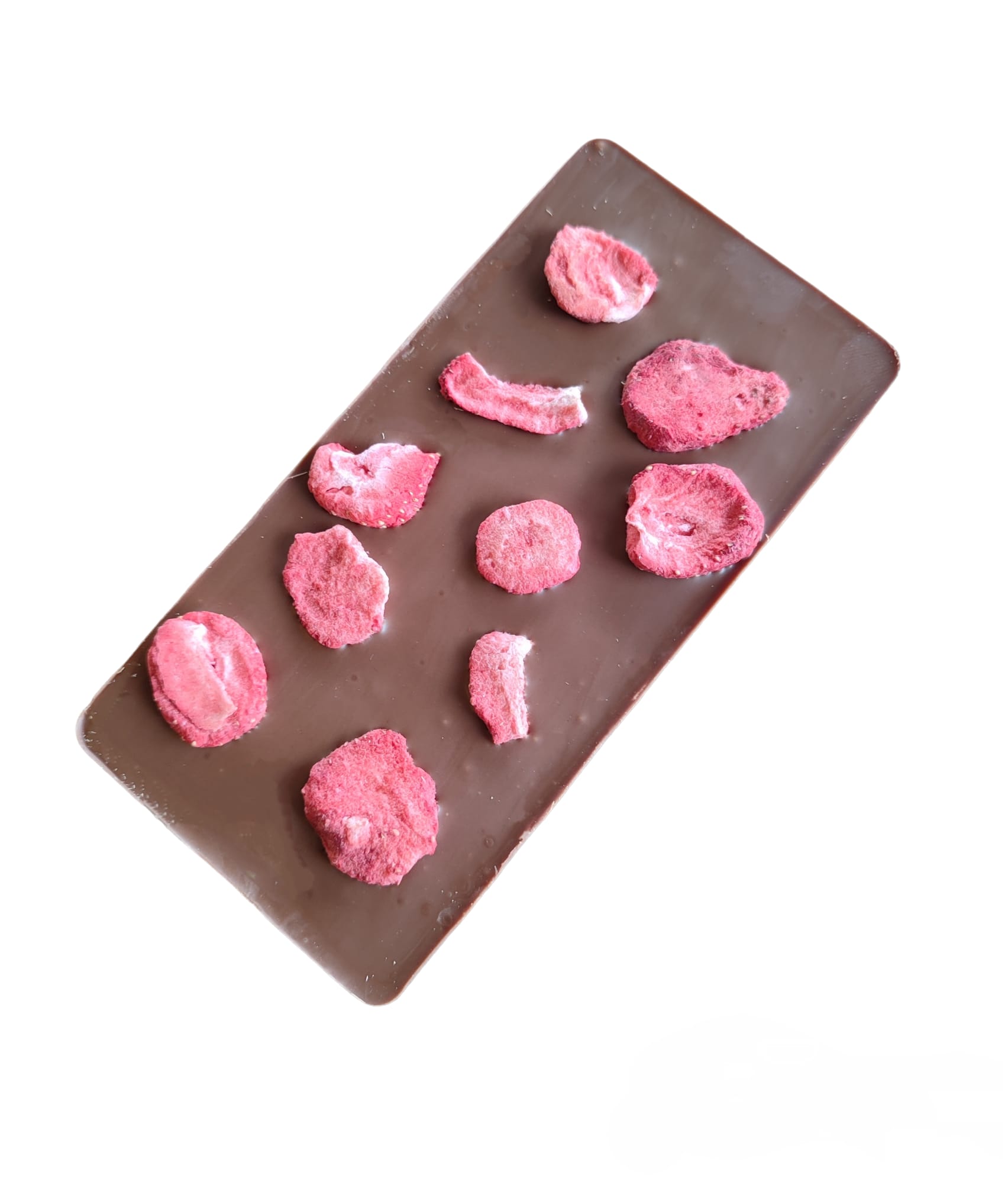 Belçika çikolatasından üretilen el yapımı sütlü çilek kırıklı tablet çikolata 100g e